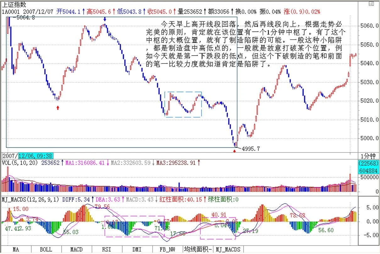 今天早上高开线段回落,然后再线段向上,根据走势必完美的原则,肯定就在该位置有一个1分钟中枢了。有了这个中枢的大概位置,就有了制造陷阱的可能。一般这种小陷阱,都是制造盘中高低点的,一般就是故意打破某个位置,例如今天就是第一下跌段的低点,但这个下破制造的笔和前面的笔一比较力度就知道肯定是陷阱了。