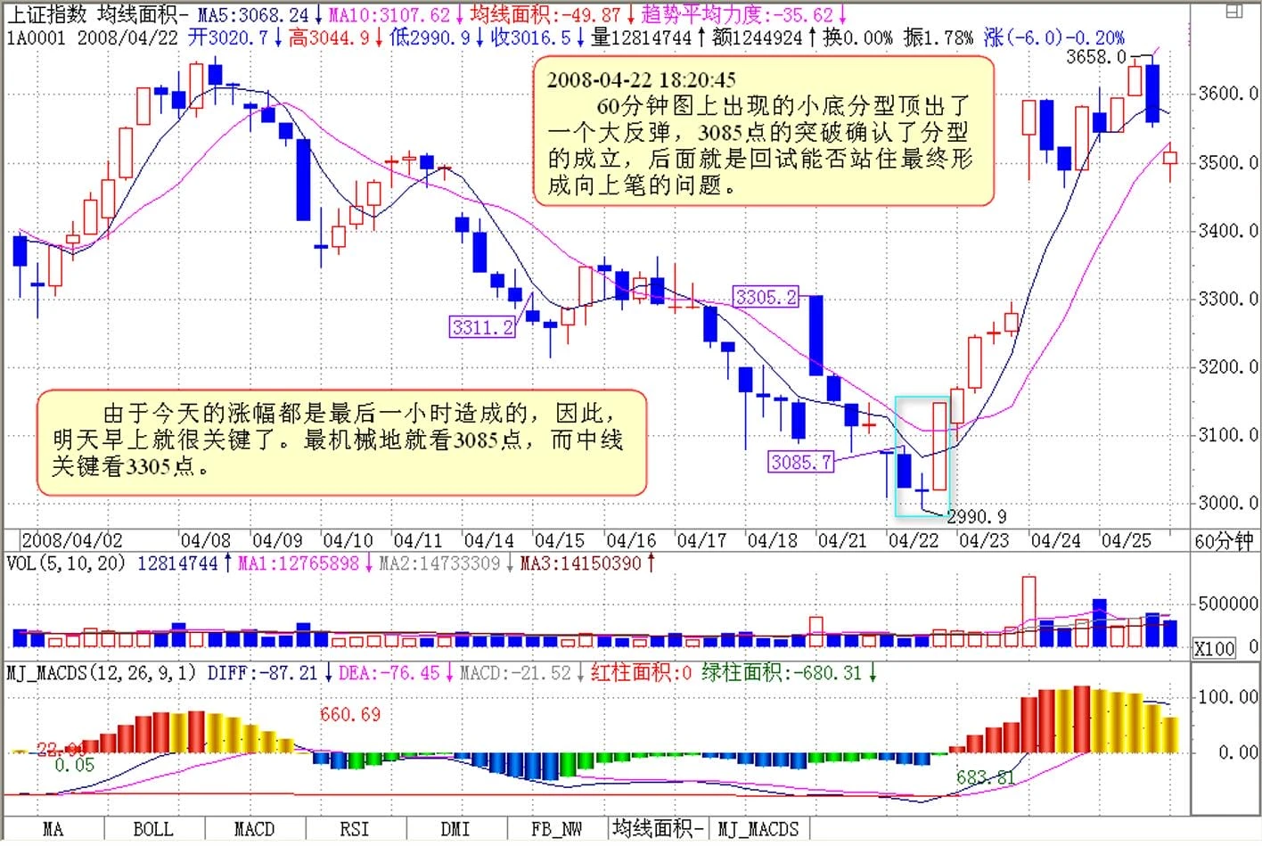 由于今天的涨幅都是最后一小时造成的,因此,明天早上就很关键了。最机械地就看3085点,而中线关键看3305点。