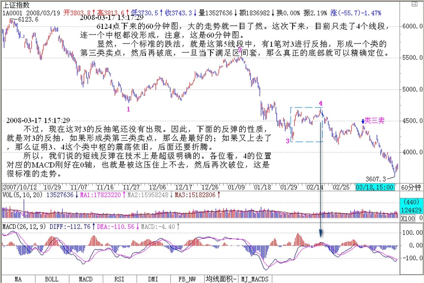 所以,我们说的短线反弹在技术上是超级明确的。各位看,4的位置对应的MACD刚好在0轴,也就是被这压住上不去,然后再次破位,这是很标准的走势。