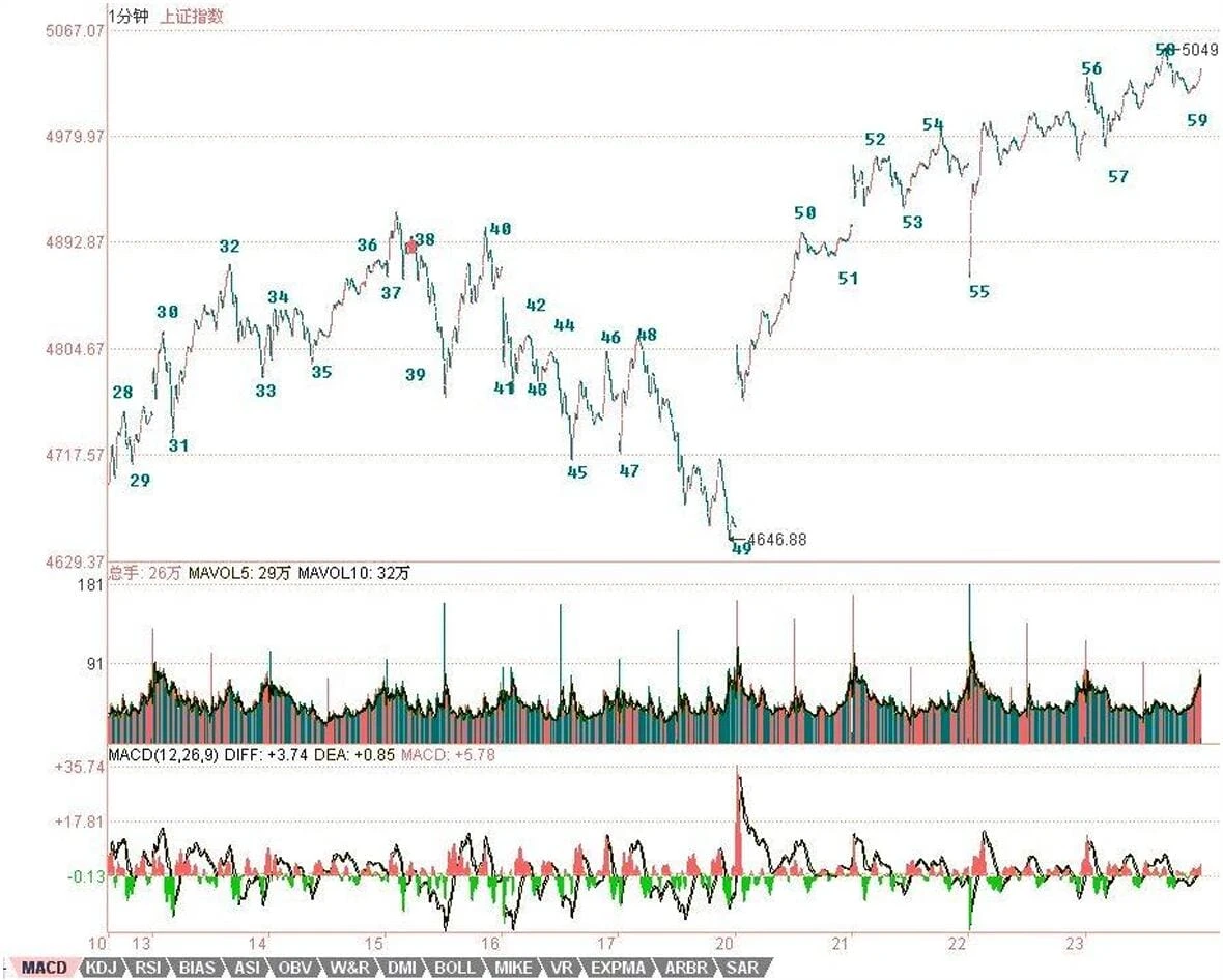 短线技术上,昨天的56,不能100%的那种情况,今天发生了。这说明什么?本ID的理论是几何,没有一种精确的数学态度,是弄不好的。任何有预测癖好的,都离技术之门远着。今天图里,昨天56的位置就要根据这种情况变了。注意,并不是本ID的划分可以随意变,而是因为昨天的走势没有100%满足本ID的划分标准,只是暂时标记。例如,今天59,同样有这个问题,那里标记上59并不是说59在那里已经完成了,因为目前没有满足59段被100%破坏的标准。而58以及以前的所有标准都是唯一的,不可更改的,为什么?因为,符合标准了,就这么简单。这个问题,一就是一,二就是二,没有任何可含糊的地方。