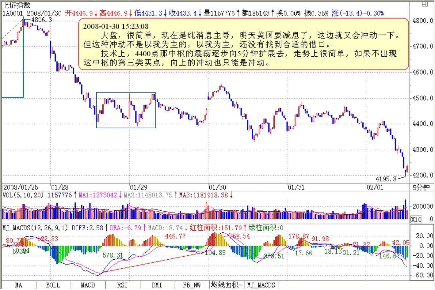 技术上,4400点那中枢的震荡逐步向5分钟扩展去,走势上很简单,如果不出现这中枢的第三类买点,向上的冲动也只能是冲动。