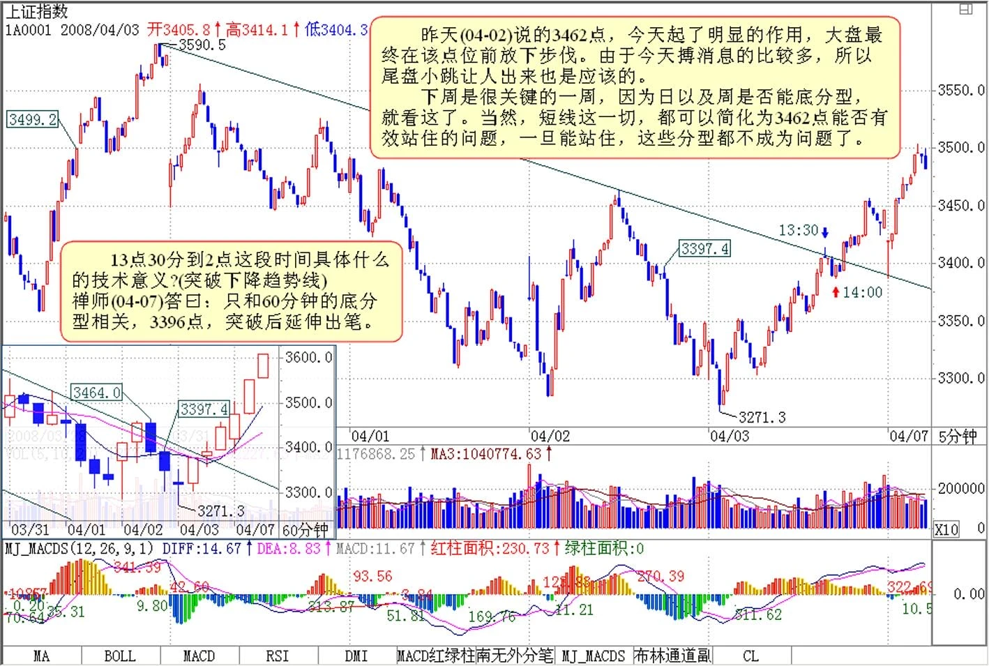 今天的走势图,超级技术化,留一个作业:13点30分到2点这段时间具体什么的技术意义,为什么一站住某位置后,就马上出现大的突破,向上攻击3462点。