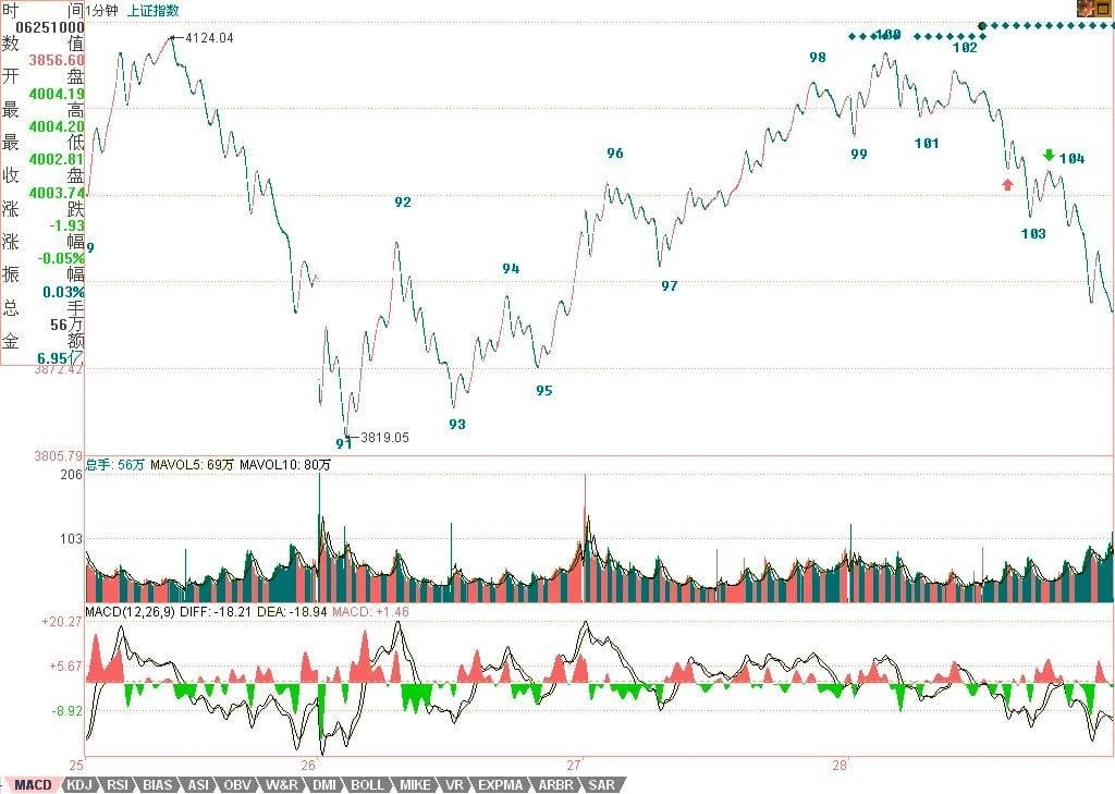 把图弄上来花了点时间,图中100的顶背驰都看不出来的,102的第二类卖点看不出的,都要抓紧学习。102后面的103在收盘时还没走完,要102走完,就是要出现线段里的底背驰。而下面箭头位置,就是大盘短线的压力所在,特别是最下面一个,必须站稳,否则大盘就是最弱走势,至少要等待出现1分钟以上级别的背驰才有介入价值。