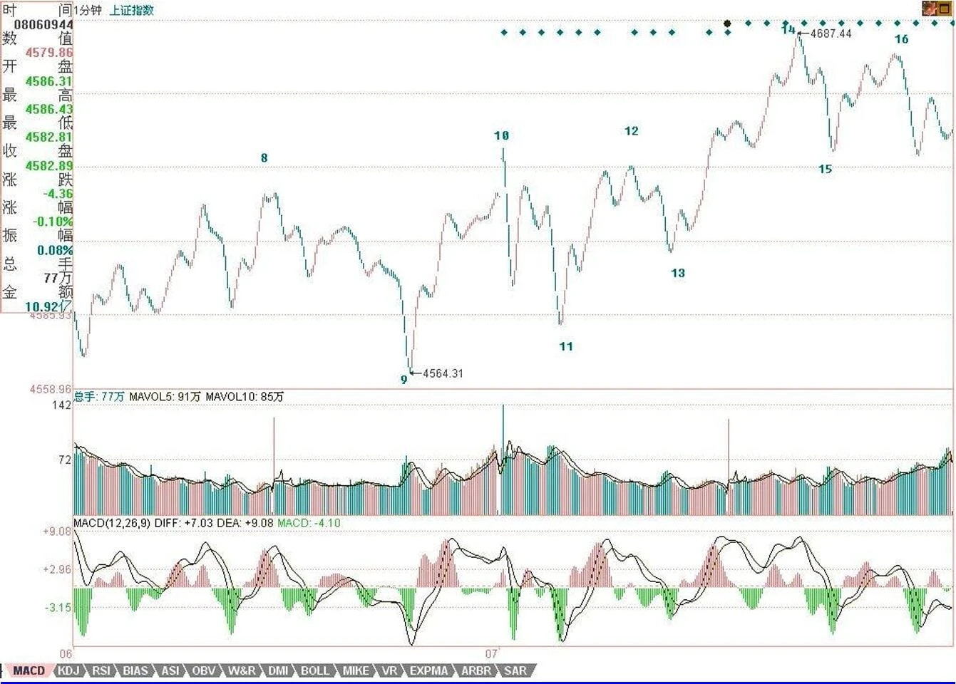 由于收盘,使得16开始的17段走势是否完成,无从判断,因此,明天一大早的走势就是决定该线段结束的位置,如果在图中10之下(也就是4645点下),那么将成一个5分钟的中枢,(8-11)+(11-14)+(14-17)。