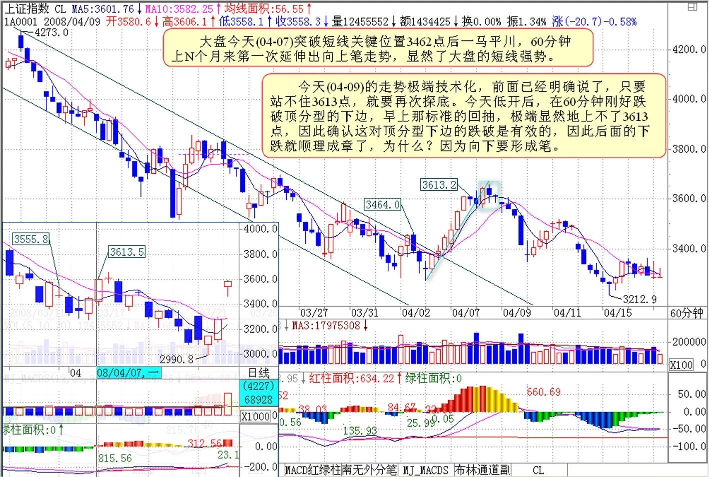 今天的走势极端技术化,前面已经明确说了,只要站不住3613点,就要再次探底。今天低开后,在60分钟刚好跌破顶分型的下边,早上那标准的回抽,极端显然地上不了3613点,因此确认这对顶分型下边的跌破是有效的,因此后面的下跌就顺理成章了,为什么?因为向下要形成笔。