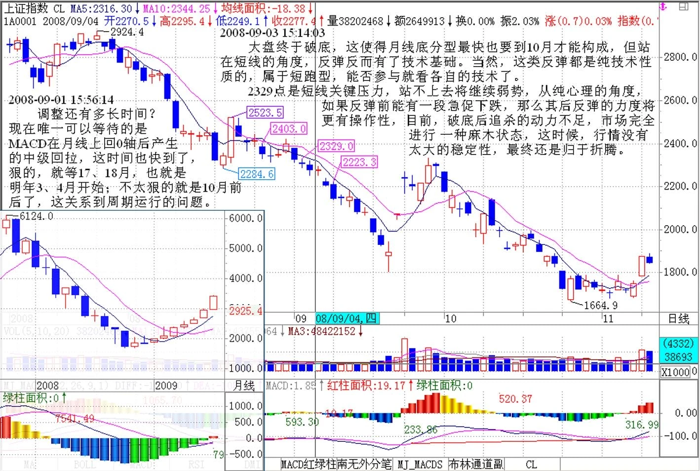 他专门问了本ID对调整的看法,因为他知道本ID6100点做空以后一直不感冒这市场,所以问本ID调整还有多长时间。因为是朋友,就直说了。如果真要重新来过,那是N年以后的事了,现在唯一可以等待的是MACD在月线上回0轴后产生的中级回拉,这时间也快到了,狠的,就等17、18月,也就是明年3、4月开始;不太狠的就是10月前后了,这关系到周期运行的问题。至于是什么时候,关键是看管理层的作为,如果吊儿郎当的,那就狠吧,一切都是因缘和合,可没有任何必须的东西现在就规定行情如何如何。