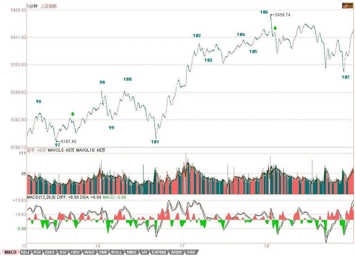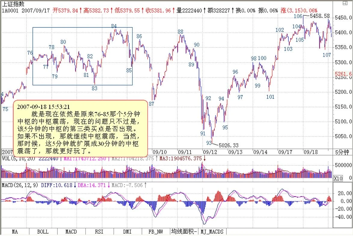 现在的情况十分简单,对于短线来说,就是现在依然是原来76-85那个5分钟中枢的中枢震荡,现在的问题只不过是,该5分钟的中枢的第三类买点是否出现。如果不出现,那就继续中枢震荡,当然,那时候,这5分钟就扩展成30分钟的中枢震荡了,那就更好玩了。
